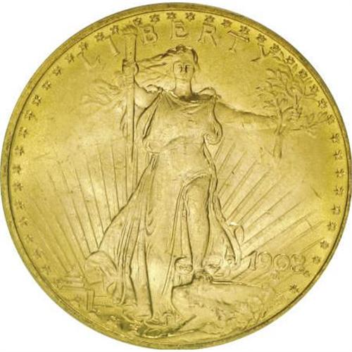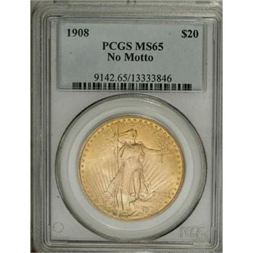 <B>1908 $20 No Motto MS65 PCGS.</B></I> PCGS Population (12093/2909). NGC Census: (7719/4332). Mintage: 4,271,551. Numismedia Wsl. Price for NGC/PCGS coin in MS65: $1,240. (#9142)<BR><BR><B>Coin Engraver:</B> Augustus Saint-Gaudens<BR><BR><b>Shipping:</b> Coins & Currency (<a target="_blank" href="http://www.heritageauctions.com/common/shipping.php">view shipping information</a>)
