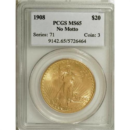 <B>1908 $20 No Motto MS65 PCGS.</B></I> Long Rays Obverse. Original lime-green and canary-gold luster dominates this well preserved Gem. Well struck on the face and Capitol building, with only minor bluntness on the raised knee and the eagle's leg.<BR><BR><B>Coin Engraver:</B> Augustus Saint-Gaudens<BR><BR><b>Shipping:</b> Coins & Currency (<a target="_blank" href="http://www.heritageauctions.com/common/shipping.php">view shipping information</a>)