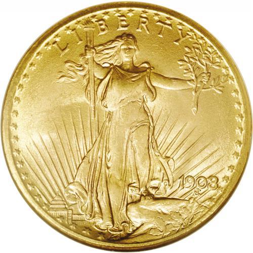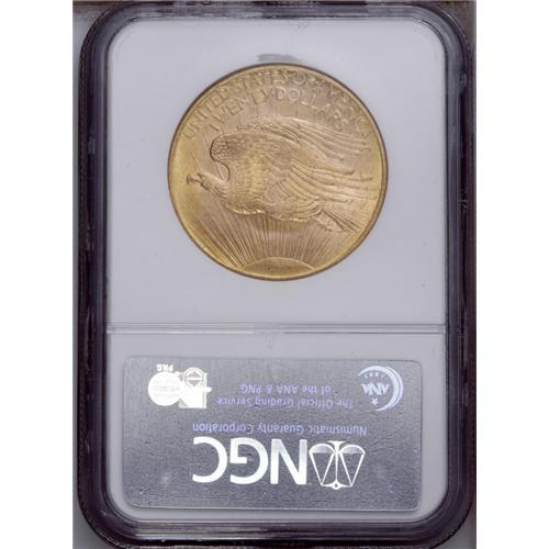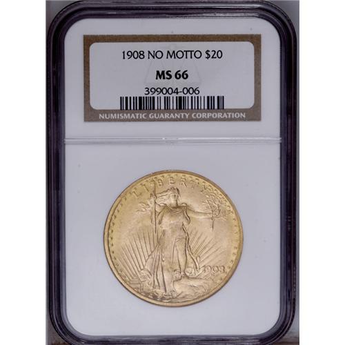 <B>1908 $20 No Motto MS66 NGC.</B></I> A little softly struck with absolutely fabulous apricot-rose coloration, shimmering full luster, and clean, unmarked, matte-like fields. A handful of small marks are located entirely on the eagle's breast.