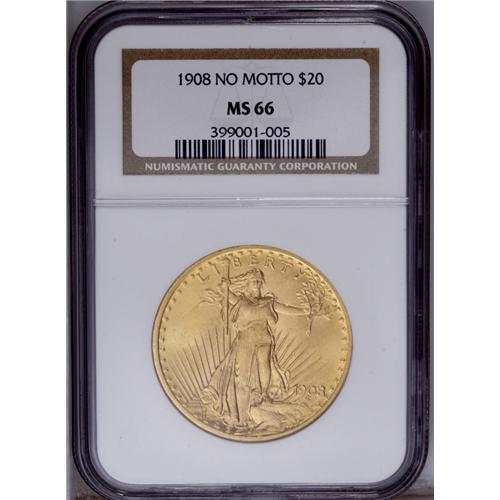 <B>1908 $20  No Motto MS66 NGC.</B></I> A shimmering, remarkably smooth representative that is further enhanced by delicate orange-gold highlights. Not only technically nice, but also an especially pleasing example as well.