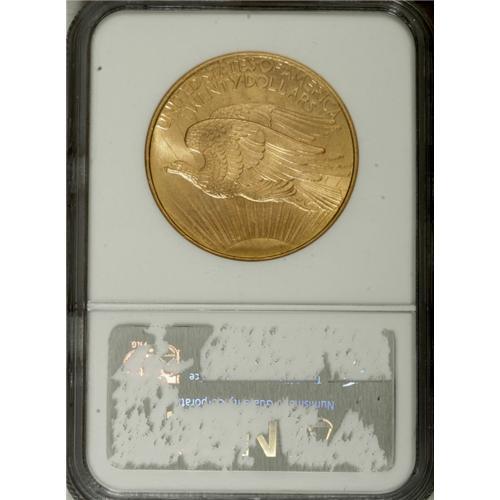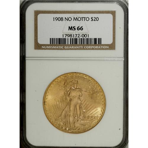 <B>1908 $20 No Motto MS66 NGC.</B></I> A suitably struck Premium Gem that sports slightly granular surfaces. Highly lustrous with few marks, though a few light luster grazes are present on the obverse.<BR><BR><b>Shipping:</b> Coins & Currency (<a target="_blank" href="http://www.heritageauctions.com/common/shipping.php">view shipping information</a>)