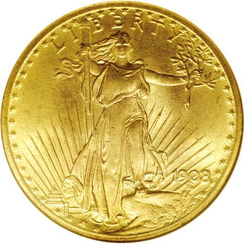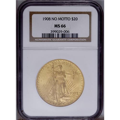 <B>1908 $20 No Motto MS66 NGC.</B></I> Boldly struck for the issue with tinges of olive and pale orange patina over minimally abraded surfaces. While not particularly scarce in better Mint State grades, this brief two-year type enjoys strong demand among 20th century type collectors.