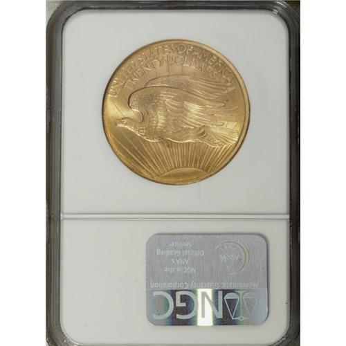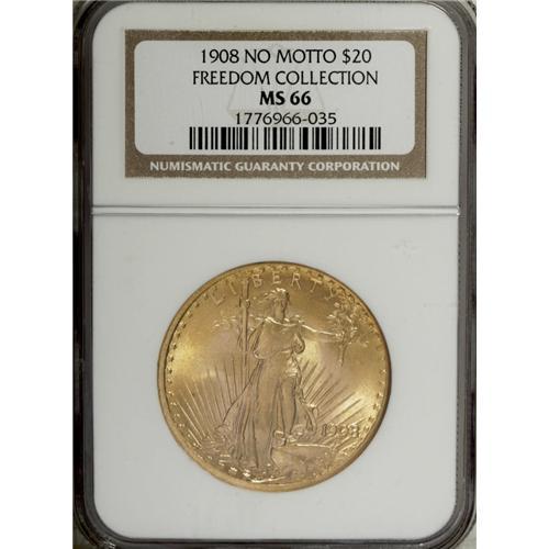 <B>1908 $20 No Motto MS66 NGC.</B></I> Ex: Freedom Collection. While Theodore Roosevelt's impassioned defense of his decision to omit IN GOD WE TRUST from coinage is legendary in numismatics, not so well known is that he deferred to the wishes of Congress and signed into law the bill that put the motto on Saint-Gaudens' designs. This well-preserved example has strong luster and smooth butter-yellow surfaces with a touch of orange. The devices are solidly struck, and the fields have only a few scattered marks.<BR><I>From The Freedom Collection.</B></I><BR><BR><b>Shipping:</b> Coin/Currency (<a target="_blank" href="http://www.heritageauctions.com/common/shipping.php">view shipping information</a>)