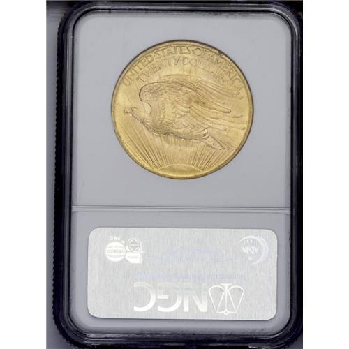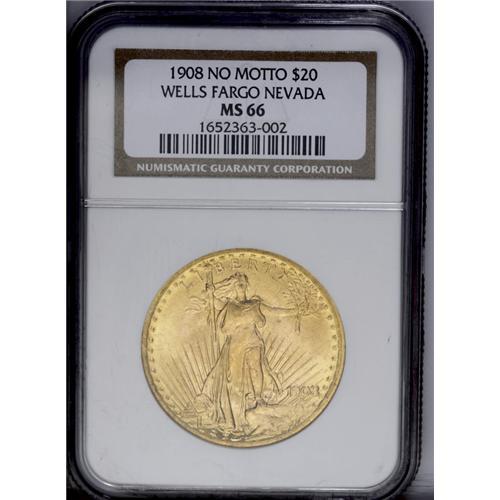 <B>1908<$20> No Motto MS66 NGC.</B></I> Ex: Wells Fargo Nevada. The median grade assigned to the Wells Fargo double eagles was MS66, a staggering number that is not approached by some modern issues. This Premium Gem is anything but average, as its highly lustrous surfaces have rich yellow-orange color and few marks. Sharply struck, though a rim bruise is noted at 1 o'clock on the reverse.