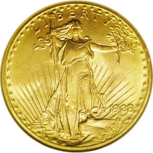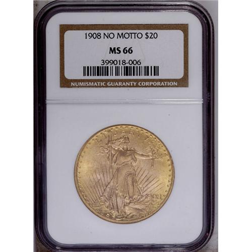 <B>1908 $20 No Motto MS66 NGC.</B></I> Light yellow surfaces with frosty luster. This is an excellent and highly appealing example.