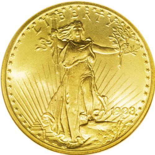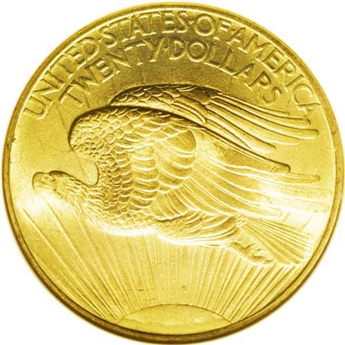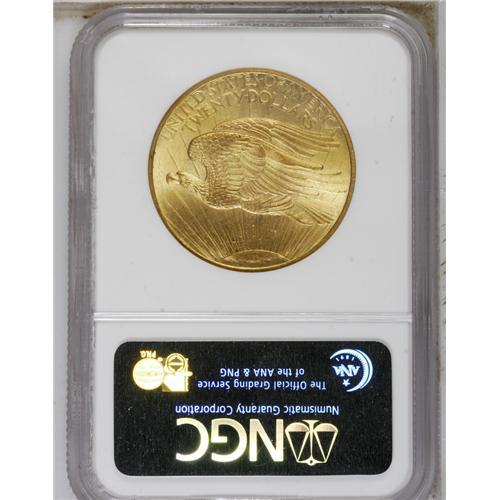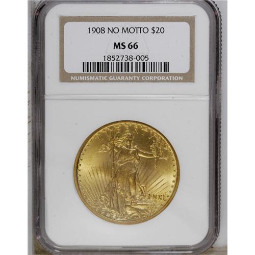 <B>1908<$20> No Motto MS66 NGC.</B></I> Long Rays Obverse. The obverse of the green-gold Premium Gem is gorgeously smooth, as is the upper reverse. The strike is slightly incomplete on the top of the sun and on the eagle's leg, and the rays near the sun display minor contact. A beautiful representative of this briefly struck type.