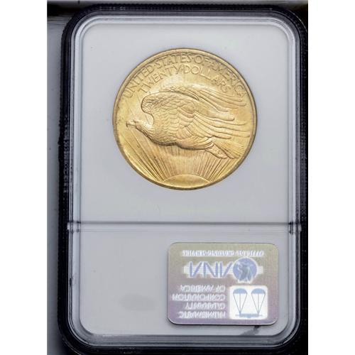 <B>1908<$20> No Motto MS66 NGC.</B></I> Radiant luster emanates from pebbly-like peach and yellow-gold surfaces that exhibit sharply struck design elements. Excellent delineation is noted on Liberty's face, on the fingers holding the branch, and toes, as well as on the panes of the Capitol building; we do mention some minor softness on the eagle's leg feathers. A few unobtrusive minute marks are visible on Liberty's legs. Great overall eye appeal!