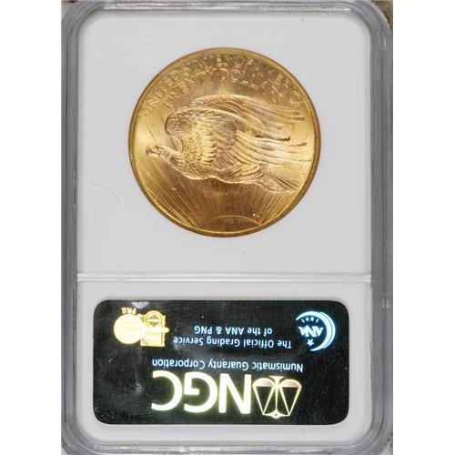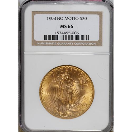 <B>1908 $20 No Motto MS66 NGC.</B></I> Short Rays Obverse. The strike is only limited by a whisper of incompleteness on the eagle's upper leg. Booming luster illuminates the impressively bagmark-free fields and devices.<BR><BR><b>Shipping:</b> Coins & Currency (<a target="_blank" href="http://www.heritageauctions.com/common/shipping.php">view shipping information</a>)
