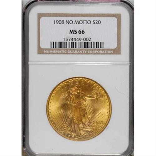 <B>1908 $20 No Motto MS66 NGC.</B></I> Short Rays Obverse. This desirable Premium Gem offers scintillating luster and exquisite preservation. Fully struck on the Capitol building, and Liberty's fingers and nose also have uncommon definition.<BR><BR><b>Shipping:</b> Coins & Currency (<a target="_blank" href="http://www.heritageauctions.com/common/shipping.php">view shipping information</a>)