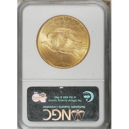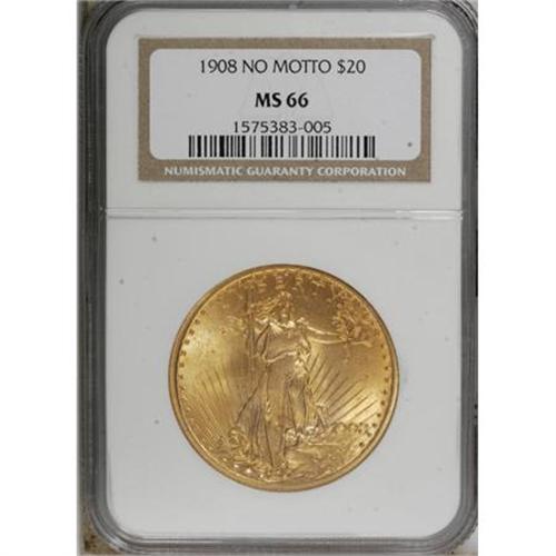 <B>1908 $20 No Motto MS66 NGC.</B></I> Long Rays Obverse. This beautiful olive and yellow-gold Premium Gem has scintillating luster and a remarkably preserved obverse. The reverse is smooth aside from minor rim contact near 9 o'clock, and an inconspicuous thin mark on the front wing. The obverse features a wire rim, a telltale indication of the penetrating strike.<BR><BR><b>Shipping:</b> Coins & Currency (<a target="_blank" href="http://www.heritageauctions.com/common/shipping.php">view shipping information</a>)