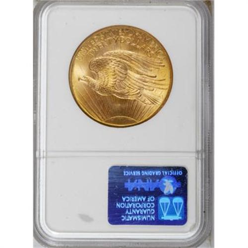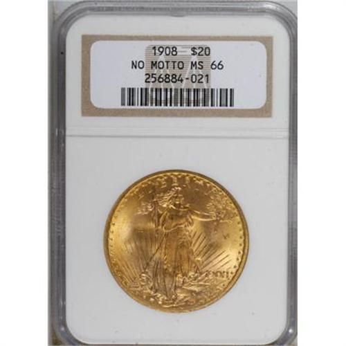 <B>1908 $20 No Motto MS66 NGC.</B></I> Short Rays Obverse. This peach-gold Gem has pleasing luster and well preserved fields. The strike is slightly incomplete on the eagle's leg, as usual for the No Motto type.<BR><BR><B>Coin Engraver:</B> Augustus Saint-Gaudens<BR><BR><b>Shipping:</b> Coins & Currency (<a target="_blank" href="http://www.heritageauctions.com/common/shipping.php">view shipping information</a>)