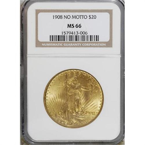 <B>1908 $20 No Motto MS66 NGC.</B></I> Radiant luster exudes from both sides of this amazing Premium Gem. A penetrating strike sharpens the design features, and peach-gold surfaces are well preserved.<BR><BR><B>Coin Engraver:</B> Augustus Saint-Gaudens<BR><BR><b>Shipping:</b> Coins & Currency (<a target="_blank" href="http://www.heritageauctions.com/common/shipping.php">view shipping information</a>)