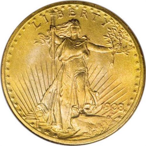<B>1908 $20 No Motto MS66 <img src="/images/star.gif" width="10" height="10" alt="" border="0"> NGC.</B></I> Light orange-gold in color, this sharply struck Premium Gem exhibits an exquisitely detailed Capitol building. Liberty's face is also exactingly struck, and only the lowest breast feathers of the eagle are not fully developed. Luster bathes the unabraded fields. Only a few ticks beneath Liberty's waist preclude an even higher grade. Census: 13 in 66 <img src="/images/star.gif" width="10" height="10" alt="" border="0">, 9 finer with the <img src="/images/star.gif" width="10" height="10" alt="" border="0"> (11/07).<BR><BR><B>Coin Engraver:</B> Augustus Saint-Gaudens<BR><BR><b>Shipping:</b> Coins & Currency (<a target="_blank" href="http://www.heritageauctions.com/common/shipping.php">view shipping information</a>)