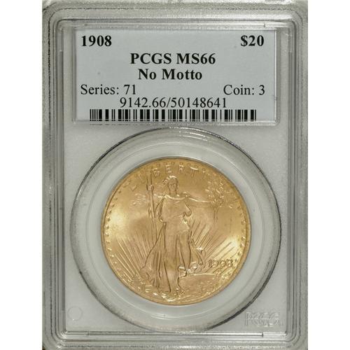 <B>1908 $20 No Motto MS66 PCGS.</B></I> A lustrous and nicely struck second year Saint-Gaudens twenty. Blushes of honey-gold patina grace the original surfaces, well-preserved despite a minor abrasion on the sun. A great example of this always-popular two-year type.<BR><BR><b>Shipping:</b> Coins & Currency (<a target="_blank" href="http://www.heritageauctions.com/common/shipping.php">view shipping information</a>)