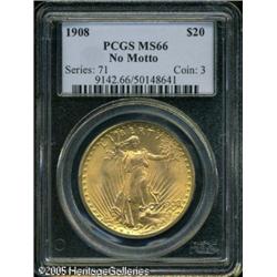 <B>1908 $20 No Motto MS66 PCGS.</B></I> A lustrous and nicely struck second year Saint-Gaudens Twenty. Blushes of honey-gold patina ensure the originality of the surfaces, which are well preserved despite a minor abrasion on the sun. The 1908 is not a rare variety, but it is in demand as a type coin since it was produced for less than two years. Lot:9470