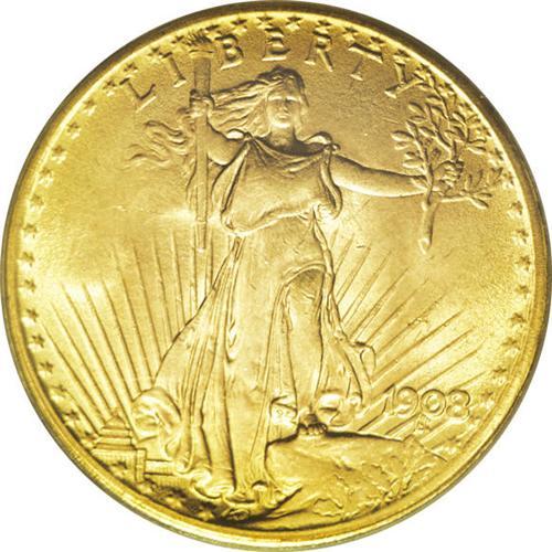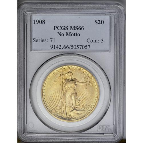 <B>1908<$20> No Motto MS66 PCGS.</B></I> A worthwhile grade for this otherwise common issue. The 1908 No Motto is all too often overlooked as a two-year type, of which the 1907 is generally unavailable in high grades. This is a notable Premium Gem. The surfaces are virtually free from abrasions, and the luster is top-rate. Both sides show some light orange-golden toning.