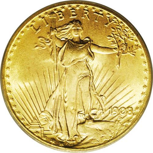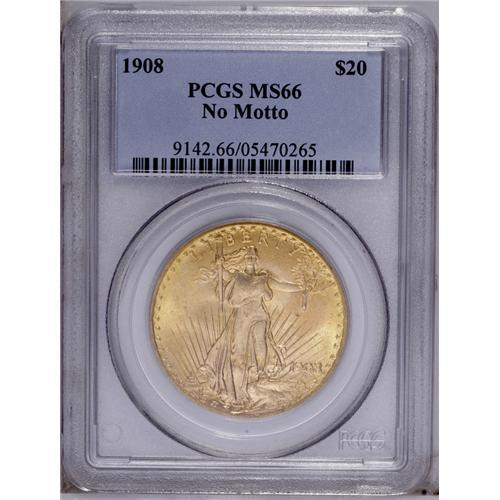 <B>1908<$20> No Motto MS66 PCGS.</B></I> An original, colorfully patinated specimen displaying great luster and only several barely visible marks on the figure of Liberty. The strike is not quite full, as is normal for this issue. A Premium Gem example of this generic date.