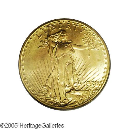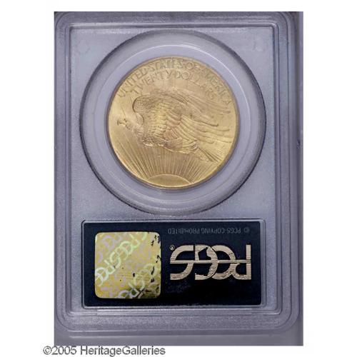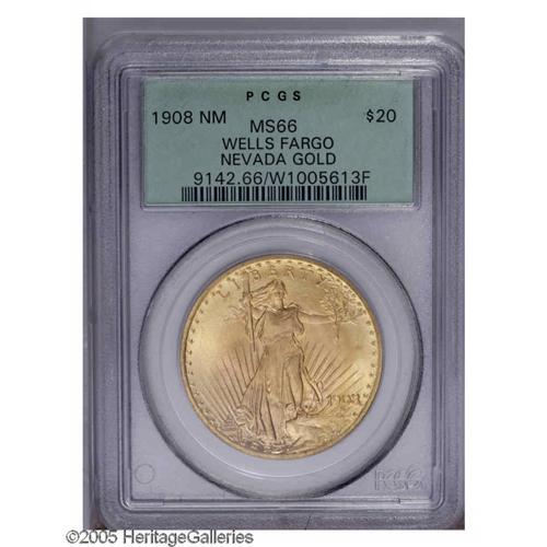 <B>1908<$20> No Motto MS66 PCGS.</B></I> Ex: Wells Fargo Nevada Gold. A sharply struck and shimmering piece with a magnificently preserved obverse and a couple of unimportant handling marks on the lower reverse. Pedigreed to the most famous hoard of this popular two-year type.