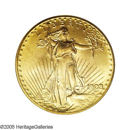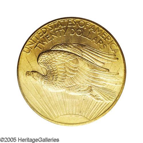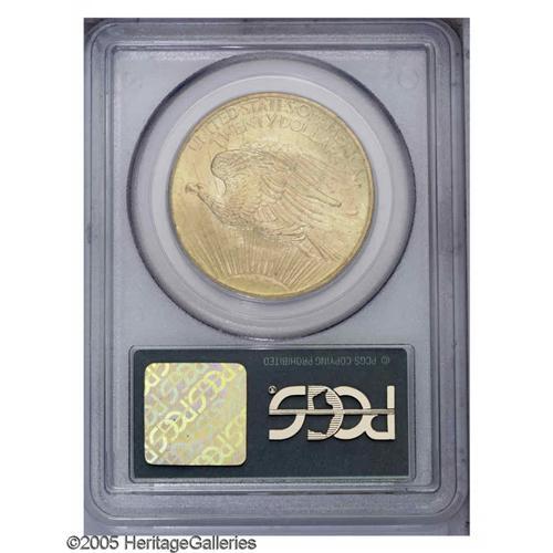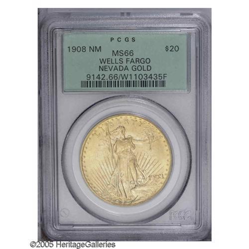 <B>1908<$20> No Motto MS66 PCGS.</B></I> Ex: Wells Fargo Nevada Gold. The Capitol building and Liberty's fingers and toes are crisply struck, while her nose and the lowest portion of the eagle's leg have only slight highpoint softness, as made. Lustrous and nearly pristine; a miniscule mark on Liberty's left breast is mentioned for accuracy. Pebbly-like surfaces yield pleasing peach-gold color. President Theodore Roosevelt believed that the motto IN GOD WE TRUST was blasphemous, since currency could be used for any purpose. Congress disagreed, however, and No Motto Twenties were only struck for two years. PCGS has certified just 42 pieces finer (11/05).<BR><I>From The Delbert McDougal Set of $20 Saint-Gaudens Coins.</B></I>