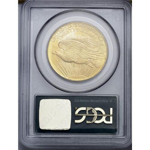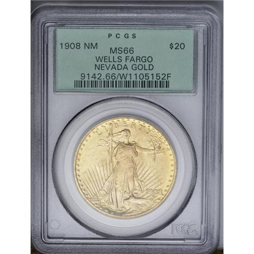 <B>1908<$20> No Motto MS66 PCGS.</B></I> Ex: Wells Fargo Nevada Gold. Short Rays Obverse. The Capitol building and Liberty's fingers are crisply struck, while her nose and the lowest portion of the eagle's leg have only slight highpoint softness, as made. Lustrous and nearly pristine. President Theodore Roosevelt believed that the motto IN GOD WE TRUST was blasphemous, since currency could be used for any purpose. Congress disagreed, however, and No Motto Twenties were only struck for two years. In a green label holder.