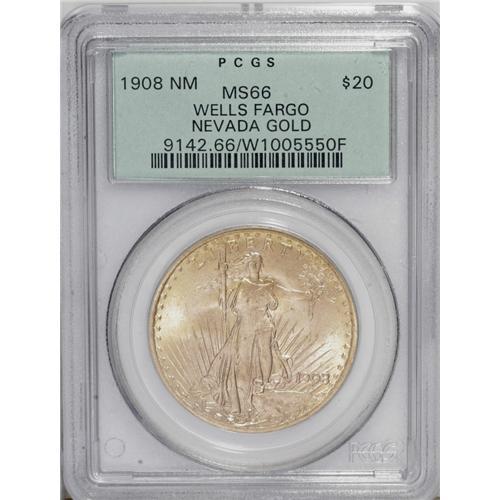 <B>1908<$20> No Motto, Wells Fargo MS66 PCGS.</B></I> Short Rays Obverse. A beautifully smooth straw-gold example from this formidable, fabled hoard of No Motto twenties. A few minute ticks on Liberty's waist and on the right side obverse rays deny perfection. Encapsulated in a green label holder.<BR><I>From The Hamburg-Sonoma Collection.</B></I>