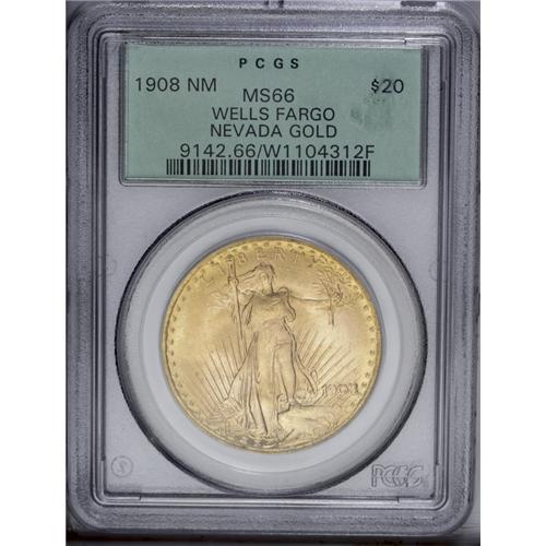 <B>1908<$20> No Motto MS66 PCGS.</B></I> Ex: Wells Fargo Nevada Gold. More than 95% of the coins in the Wells Fargo Hoard were certified as Gems or better, an impressive level of consistent quality. This nicely struck honey-gold piece is among those quality coins, with highly lustrous surfaces that display only minimal marks. An immensely appealing piece housed in a green label holder.<BR><I>From The Hamburg-Sonoma Collection.</B></I>