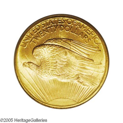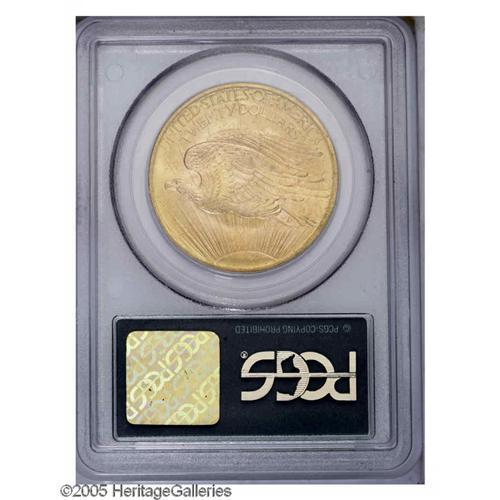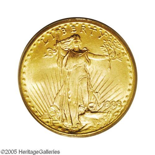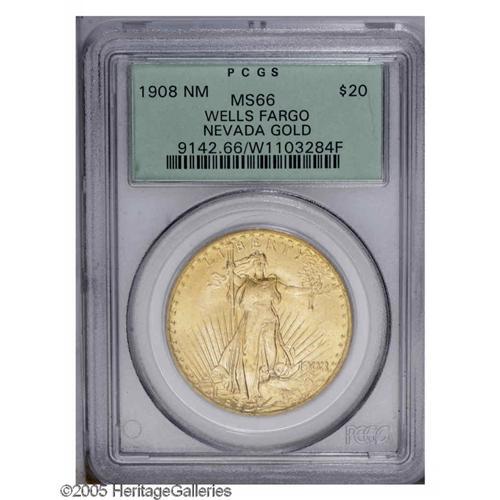 <B>1908<$20> No Motto MS66 PCGS.</B></I> Ex: Wells Fargo Nevada Gold. Uncommonly smooth with rich, reddish-gold color. Both sides are fully frosted with an above average impression for this often inadequately defined issue, and abrasions are held to an absolute minimum.