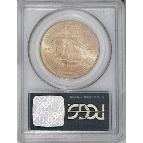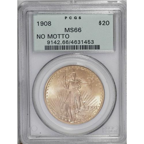 <B>1908<$20> No Motto MS66 PCGS.</B></I> Short Rays Obverse. Unusually well-preserved and appealing, this solidly struck example has highly lustrous orange-gold surfaces. A single small copper spot is noted above Liberty's right (facing) arm and a mark appears between two rays on the obverse, but these flaws are trivial at worst. An amazing piece that is housed in a green label holder.