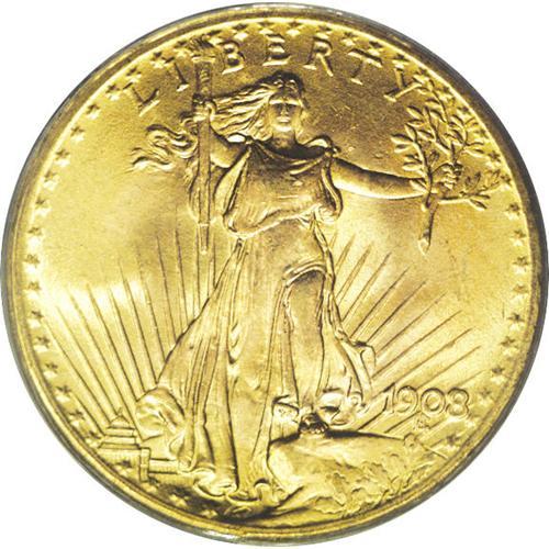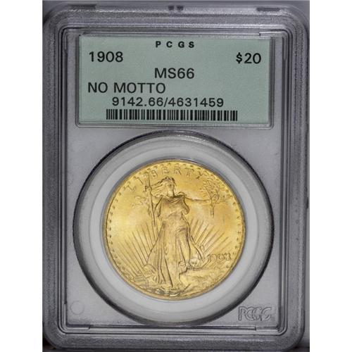 <B>1908<$20> No Motto MS66 PCGS.</B></I> Well struck with shimmering mint frost and rich, variegated apricot-green and rose toning over both sides. Carefully preserved and housed in an early PCGS holder with a green label. A truly lovely Premium Gem from the second year of the Saint-Gaudens double eagle series.