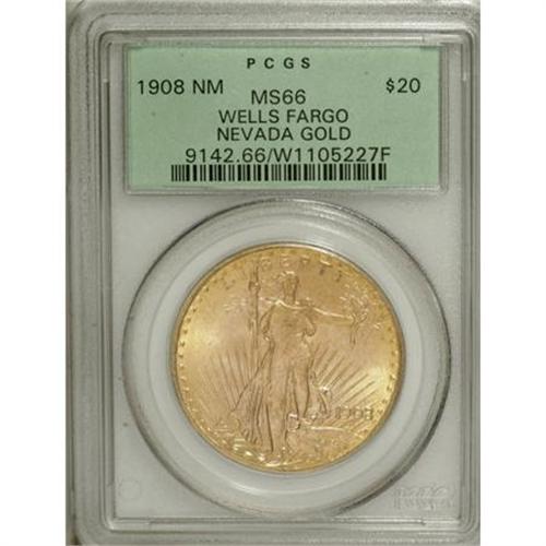 <B>1908 $20 No Motto, Wells Fargo MS66 PCGS.</B></I> A quintessentially attractive representative from one of the most famous single-issue hoards in numismatic history. The subtly lustrous peach-gold surfaces are carefully preserved overall, though a mark is noted on the eagle's wing. Housed in a green label holder.<BR><BR><b>Shipping:</b> Coins & Currency (<a target="_blank" href="http://www.heritageauctions.com/common/shipping.php">view shipping information</a>)