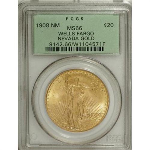 <B>1908 $20 No Motto, Wells Fargo MS66 PCGS.</B></I> Short Rays obverse. A handsome khaki-gold Premium Gem with impressively unabraded fields and devices. The strike is attentive, since any incompleteness is limited to the eagle's leg. Housed in a green label holder.<BR><BR><b>Shipping:</b> Coins & Currency (<a target="_blank" href="http://www.heritageauctions.com/common/shipping.php">view shipping information</a>)