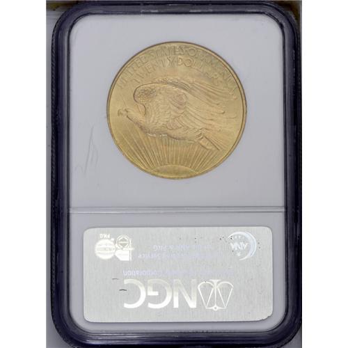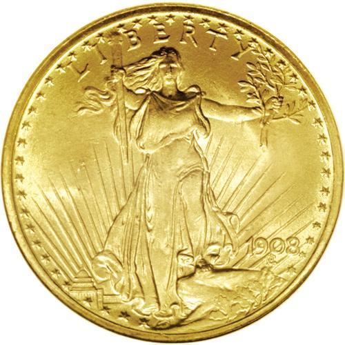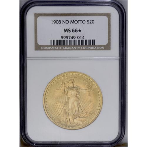 <B>1908 $20  No Motto MS66 <img border='0' src='http://www.heritagecoins.com/images/star.gif' width=10 height=10> NGC.</B></I> This sharply struck and original premium Gem blends olive and peach tones, and is refreshingly without any but the most trivial marks. The second of only two years in the series that come without the motto IN GOD WE TRUST above the sun.