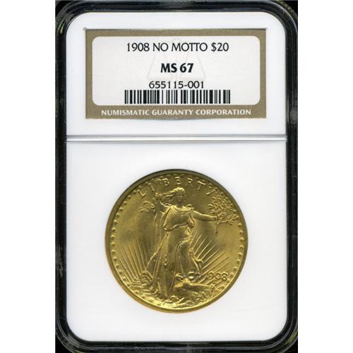 <B>1908 $20  No Motto MS67 NGC.</B></I> A nearly unabraded matte-like representative with blushes of delicate reddish patina on each side. Only under close inspection is a wavy hairline scratch noticed to the left of the torch on the obverse.