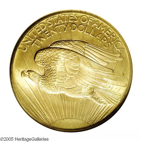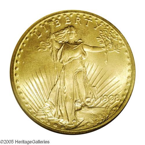 <B>1908<$20> No Motto MS67 NGC.</B></I> Ex: Wells Fargo Nevada Gold. The 1908 No Motto has always been a relatively available type coin, and now with the entrance into the market of the Wells Fargo Hoard, it is even more available to a wider range of collectors. The example offered in the present lot consists of a mix of apricot and brass-gold patina with highly lustrous surfaces that have been impeccably preserved. The design elements are exquisitely struck, including excellent definition on the Capitol dome, the olive branch, and the leaves beneath the rock. This coin generates great overall eye appeal.<BR><I>From The Phillip H. Morse Collection of Saint-Gaudens Coinage, Part Two.</B></I>
