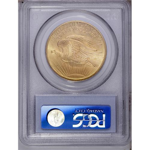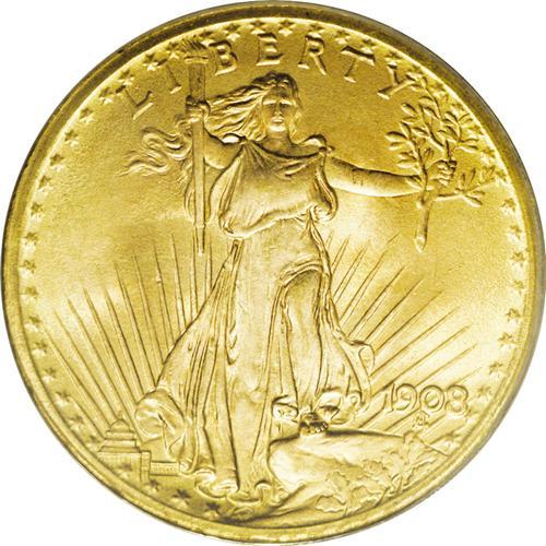 <B>1908<$20> No Motto MS67 PCGS.</B></I> In terms of sheer eye appeal, this coin is difficult to better. Much of the appeal is seen on the surfaces of this piece is from the original, primarily reddish-golden coloration with lilac patina over the highpoints and within the recesses. The coin's smooth, frosted mint luster is another plus as well as the exceptionally clean surfaces. To the unaided eye, there are no mentionable abrasions. A lovely, high grade example of this always-popular type coin. Population: 42 in 67, 1 finer (1/06).