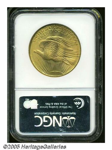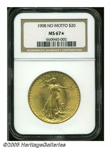 <B>1908<$20> No Motto MS67 <S NGC.</B></I> This gorgeous Superb Gem exhibits waves of luminous peach color across the devices, while olive-gold hues dominate the margins. The creamy cartwheel luster does not reveal any noticeable contact as it sweeps across the undisturbed surfaces. Well struck on the Capitol building and on Liberty's face, knee, and fingers. Minor incompleteness of strike is observed on the reverse border. The obverse has a wire rim across the diameter, while the reverse exhibits the usual flat rim.