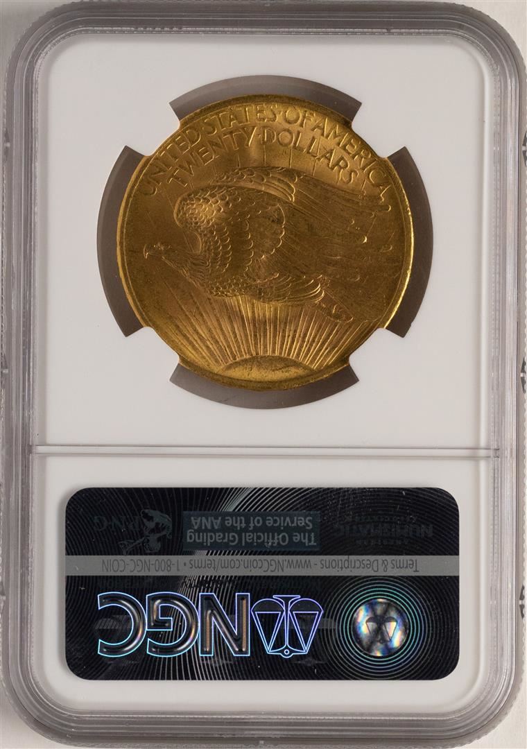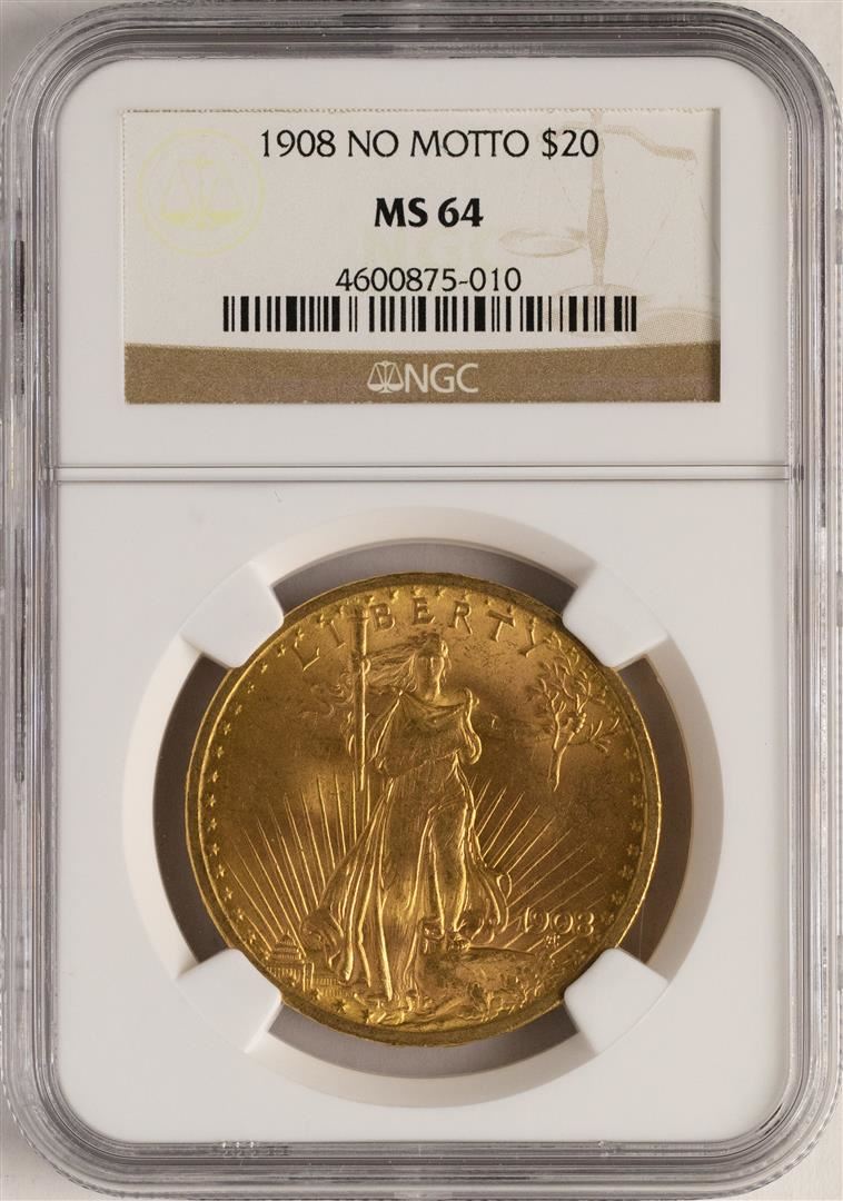 One 1908 $20 No Motto Saint Gaudens Double Eagle Gold Coin NGC MS64. NGC Certified.
