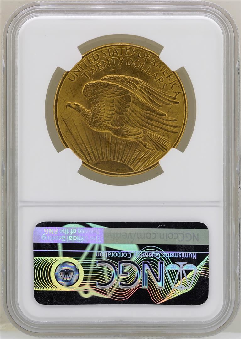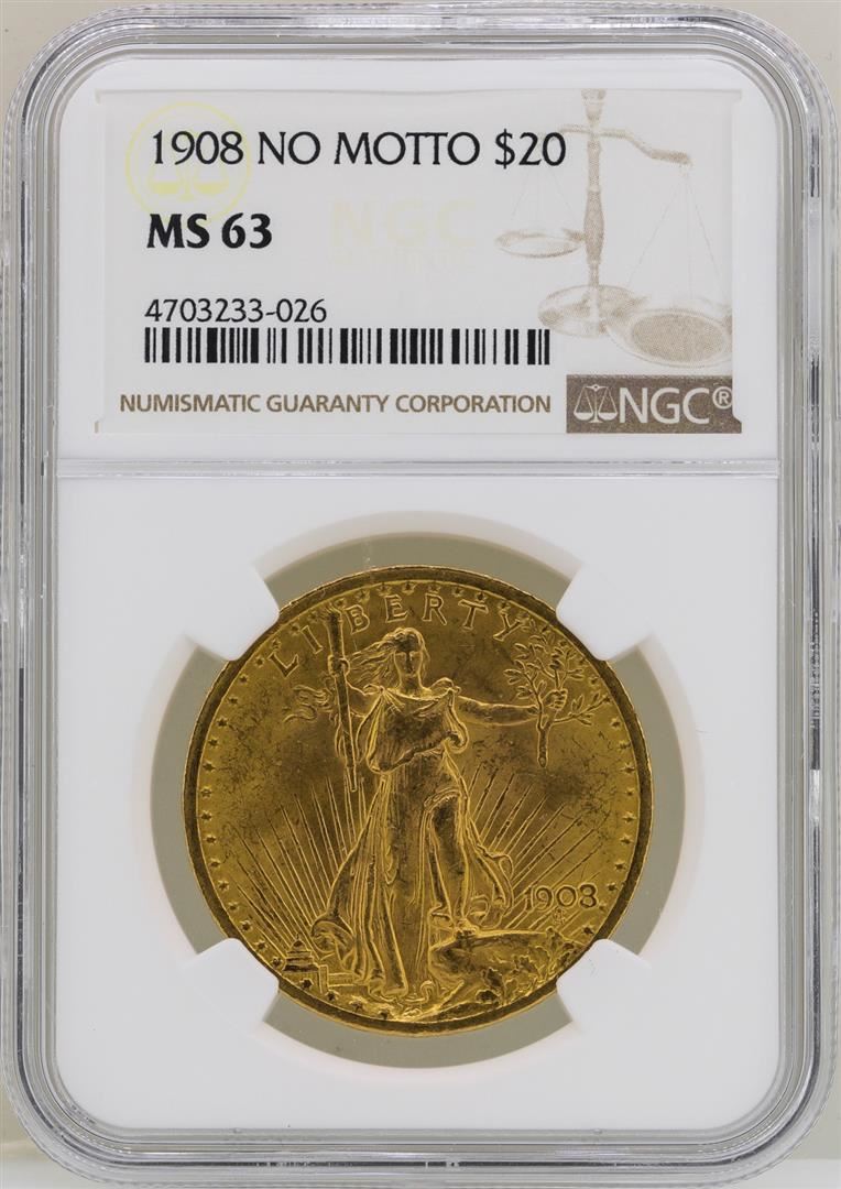 One 1908 $20 No Motto St. Gaudens Double Eagle Gold Coin NGC MS63. NGC Certified.