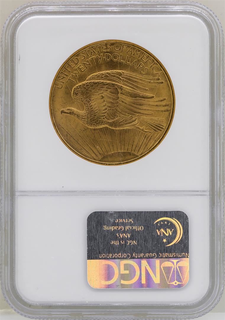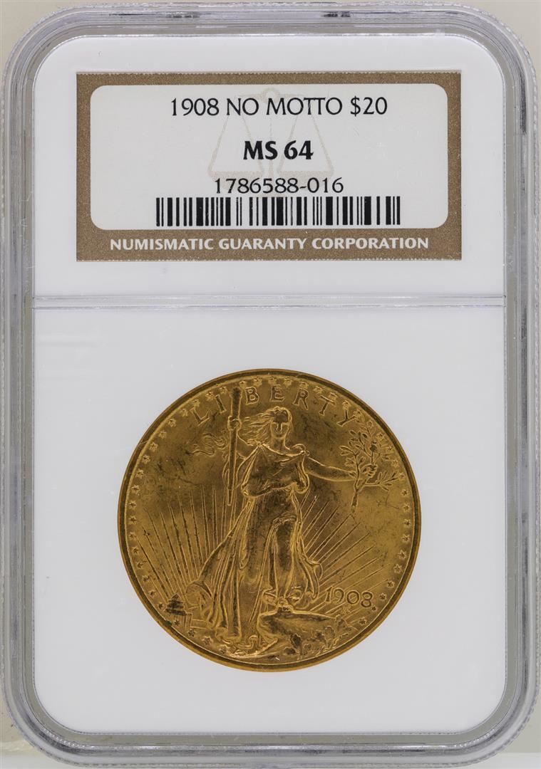 One 1908 $20 No Motto St. Gaudens Double Eagle Gold Coin NGC MS64. NGC Certified.