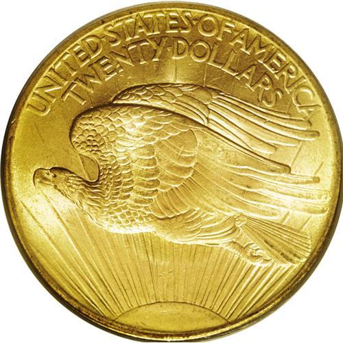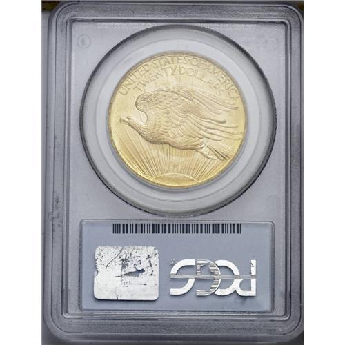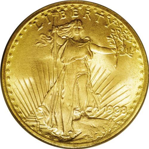<B>1908<$20> No Motto, Wells Fargo MS66 PCGS.</B></I> Short Rays. A rich apricot-gold and green-gold Premium Gem that has an excellent strike and a virtually immaculate reverse. The obverse is also well preserved. It is little known that two varieties of No Motto twenties exist. On the Short Rays variant, the obverse rays end approximately 1 mm from the branch stem.<BR><I>From The Belle Glade Collection.</B></I>
