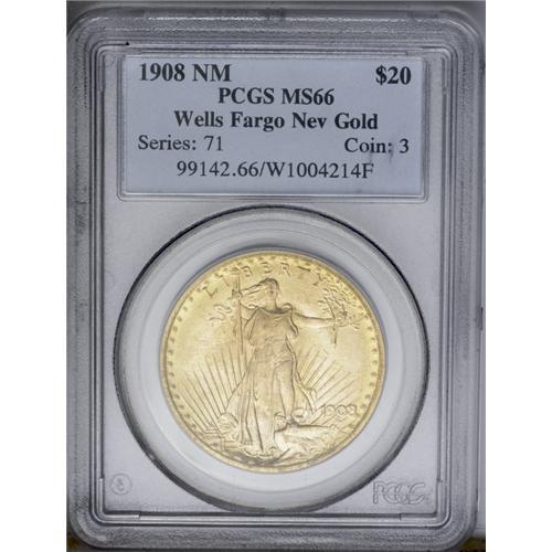 1908 $20 No Motto, Wells Fargo MS66 PCGS. Short Rays.
