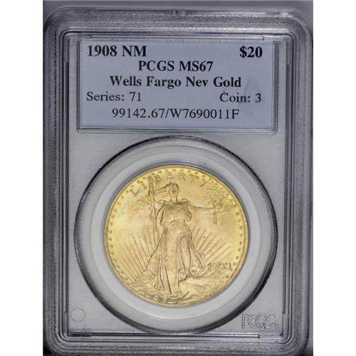 1908 $20 No Motto, Wells Fargo MS67 PCGS. Like the dou