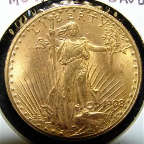 1908 $20 ST. GAUDENS GOLD COIN. Unc. No motto.