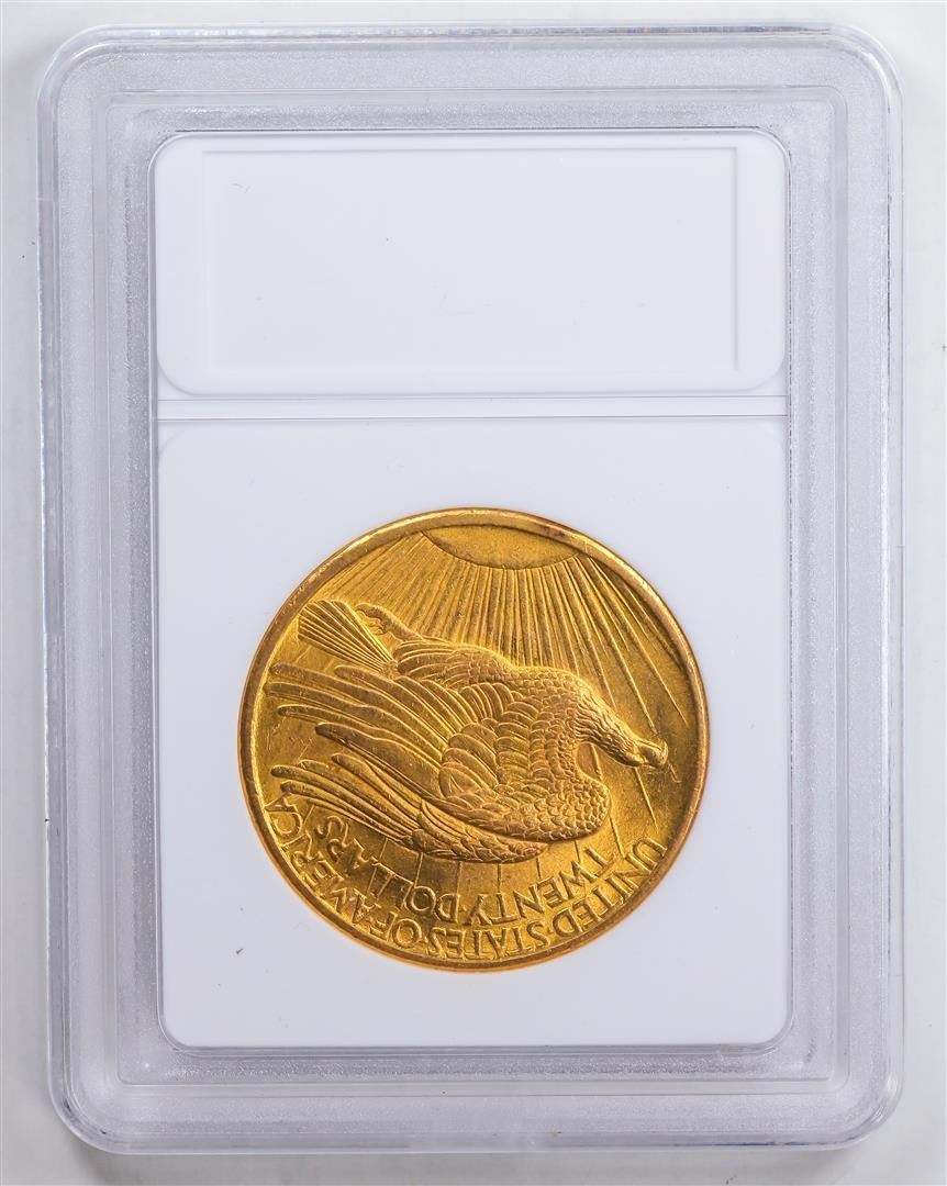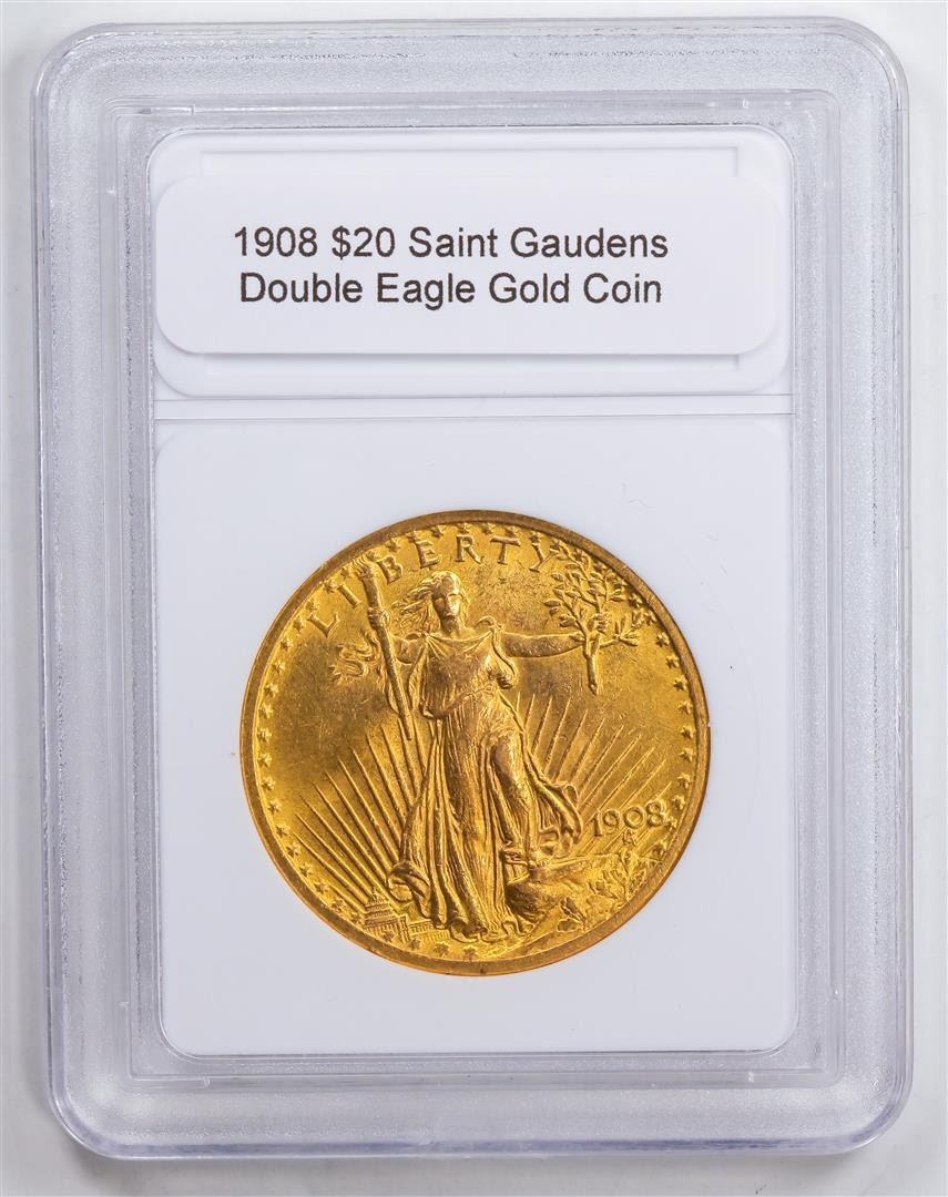 One 1908 $20 Saint Gaudens Double Eagle Gold Coin.
