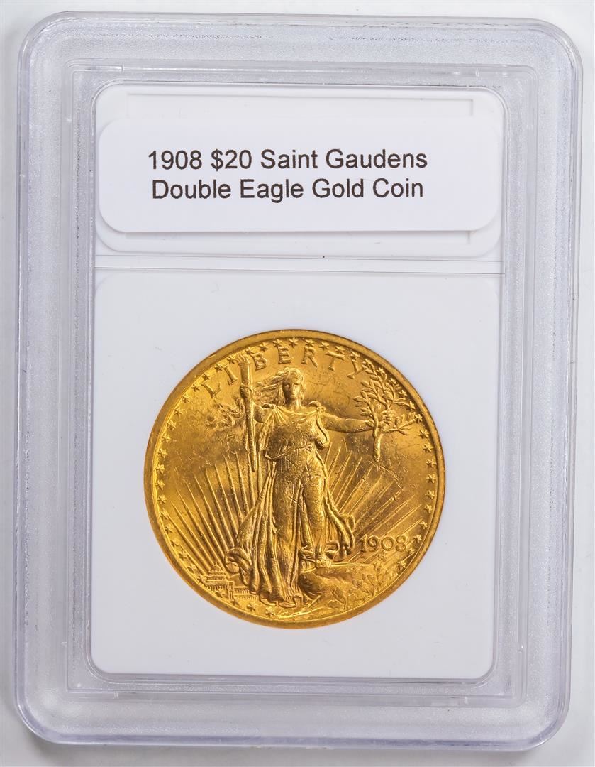 One 1908 $20 Saint Gaudens Double Eagle Gold Coin.