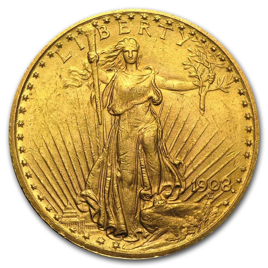One 1908 $20 Saint Gaudens Double Eagle with Motto Gold Coin.