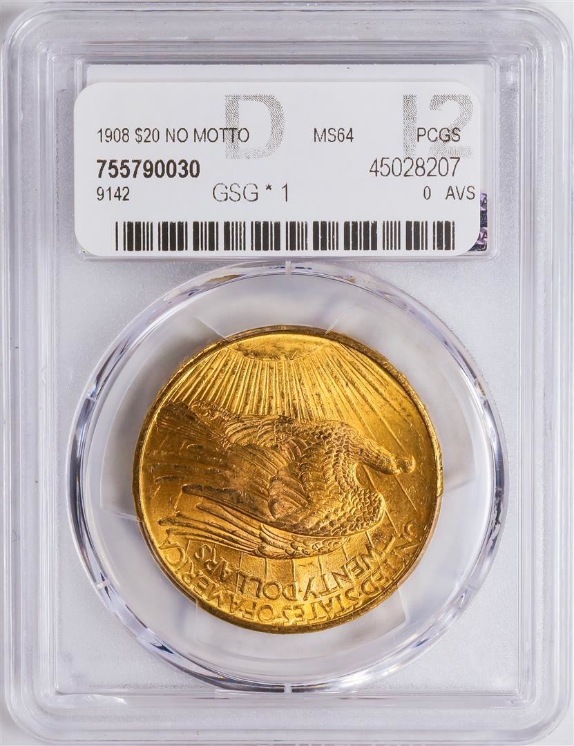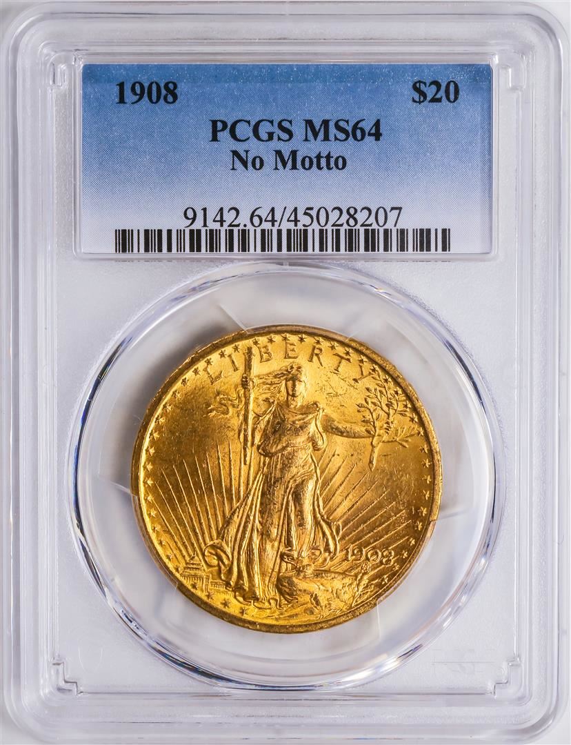 One 1908 $20 St. Gaudens Double Eagle Gold Coin PCGS MS64.
