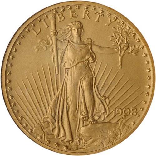 The mint struck 101 Proofs of this high denomination gold coin in 1908. All were issued with the IN GOD WE TRUST motto, a result of Congressional response to criticism of the action taken by President Roosevelt who eliminated the motto from the newly designed Saint-Gaudens gold pieces in 1907. Roosevelt was a devoutly religious man. He objected to seeing the name of the deity on coinage, and had the courage to impose his convictions on the mint (and thereby on the American public). In 1908, there were two sand-blast or matte finishes used, a lighter one of which only 3 are known and the darker finish of the type offered here. This piece very closely resembles the lower denomination Proofs of 1908 which have a coarse-grain finish. Even though the surfaces are deeper in hue than seen on later issues, there is a considerable sparkle of the sandblast finish that is visible when viewed with a loupe.