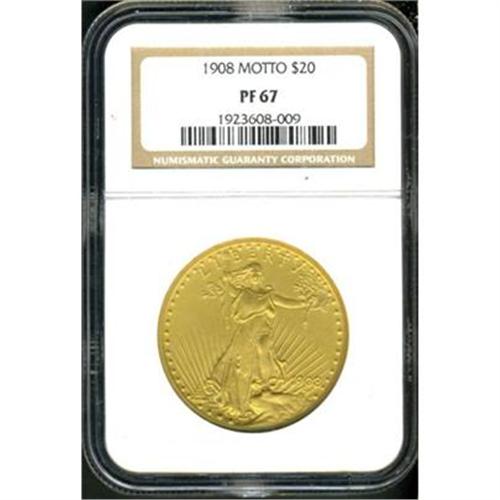 <b>1908 $20 St. Gaudens. With motto. NGC graded Proof 67.</b> Pop: 7/2. If you have yet to make an acquaintance with a Matte Proof double eagle, this is an impressive example of the Type. As referred to below in our background description, the 1908 is first year with the matte finish in this large $20 format. The only surface flaws we can detect is a faint hairline on some of the trailing wing feathers: everywhere else the surface is pristine, indeed virtually "as made" and therefore perfect. Thus, the Proof 67 grade of this impressive coin which stands head and shoulders above the few others seen. Do not be afraid of winding up your delivery to a high pitch when throwing your bid or bids at the auctioneer. He won't stop batting them back to you until yours is the highest and final one, and all the other bidders have bowed out, so accept his challenge, stand firm, and become the coin's new owner. This coin is housed in NGC holder 1923608-009; only 5 Proof 67 examples certified by NGC as of June 2005, with 1 higher.