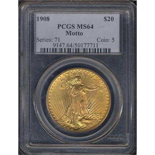 <b>1908 $20 St. Gaudens. With motto. PCGS graded MS64.</b> PCGS Pop: 299. Well struck with smooth, velvety luster plus nice orange-gold shades <b>(PCGS # 9147)</b> <i>